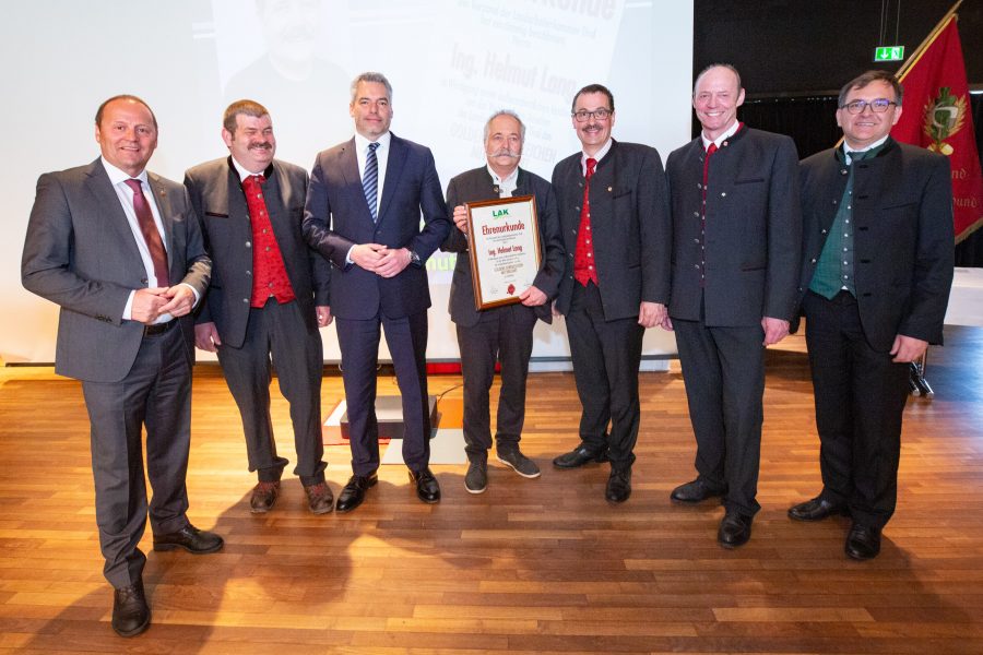 Nach dem obligatorischen Kassabericht und der einstimmigen Entlastung des Vorstandes durch die Vollversammlung wurden 21 langjährige Ortsvertrauensleute geehrte sowie an den langjährigen Kammerrat und Vorsitzenden des Kontrollausschusses Ing. Helmut Lang aus Pettnau das Goldene Ehrenzeichen mit Brillant der Landarbeiterkammer Tirol für seinen jahrzehntelangen Einsatz für die Beschäftigten in der Land- und Forstwirtschaft verliehen.